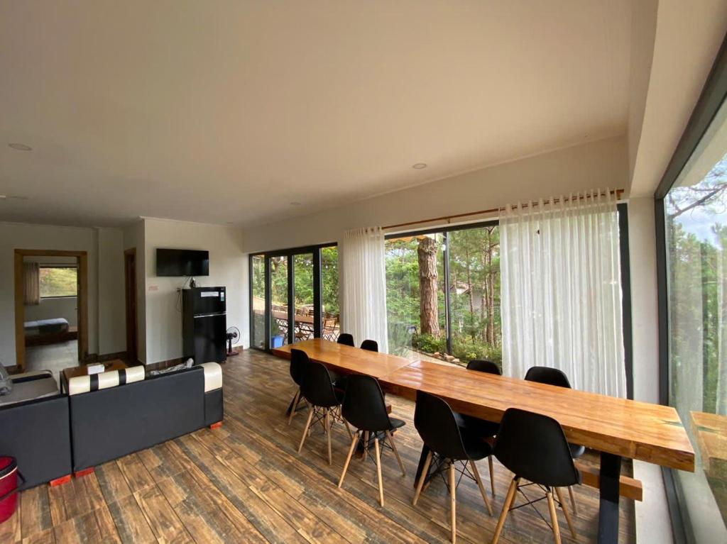 Không gian sinh hoạt chung được bố trí đầy đủ với phòng khách và khu bếp tiện lợi, phù hợp cho các buổi sum họp, nấu ăn và sinh hoạt cùng nhau. Sunset Villa có sức chứa tiêu chuẩn 20 khách, sở hữu view nhìn ra đồi núi và thành phố, mang đến cảm giác thoáng đãng và thư giãn. Ngoài ra, villa còn có bãi đậu xe riêng, sân BBQ ngoài trời và bàn bi lắc, giúp kỳ nghỉ thêm phần vui vẻ và trọn vẹn.