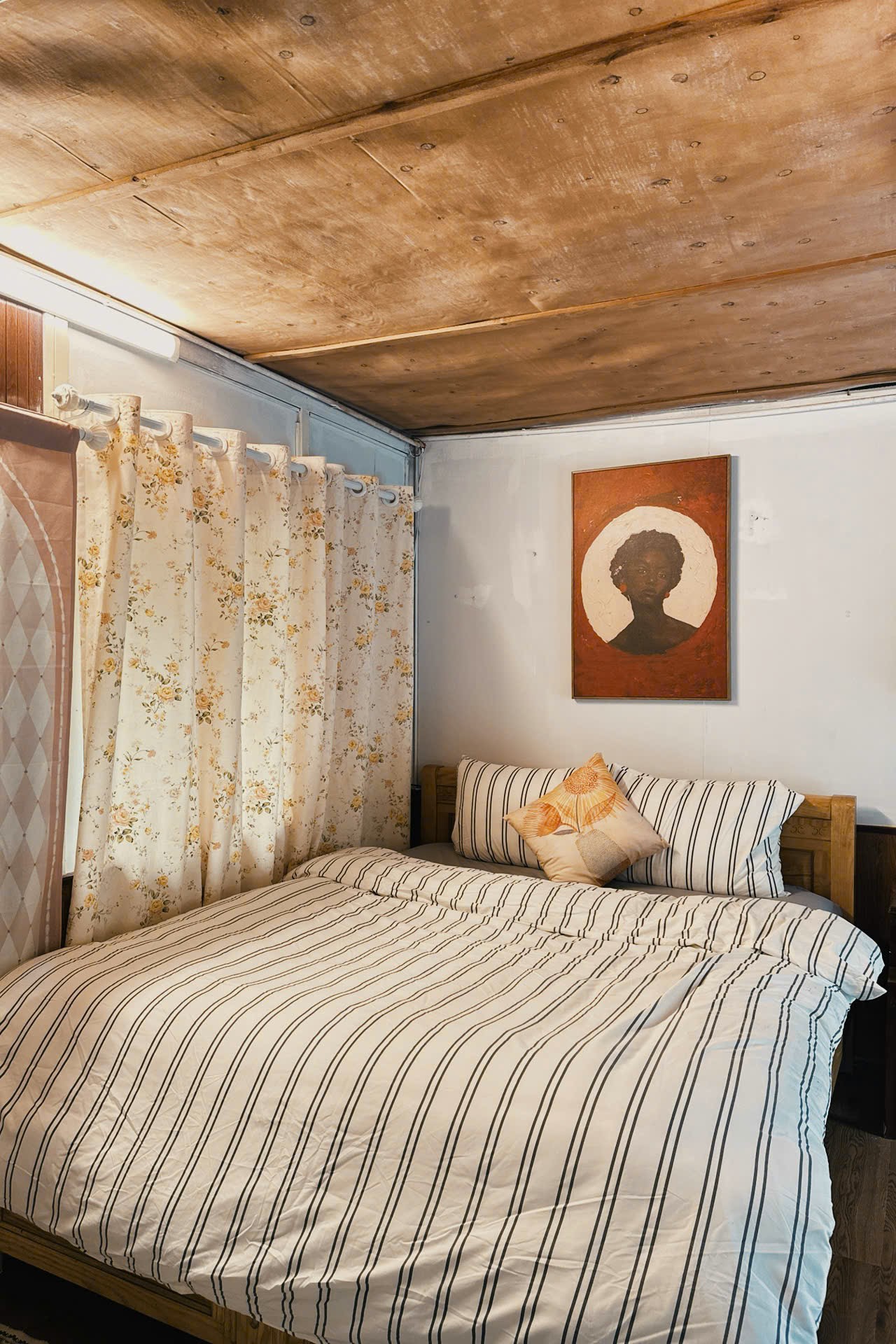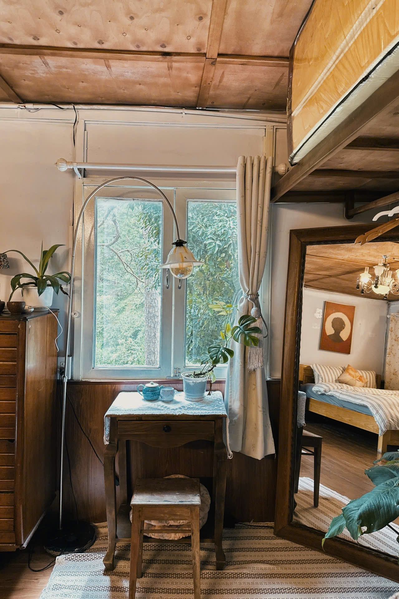 Tầng trên là phòng ngủ rộng rãi, bố trí hai giường đôi với ánh sáng dịu nhẹ, tạo cảm giác dễ chịu mỗi khi bạn trở về sau một ngày khám phá. Các chi tiết nội thất được chọn lọc kỹ để giữ nguyên chất “ấm” của gỗ, giúp căn phòng luôn mang nét thân thuộc.