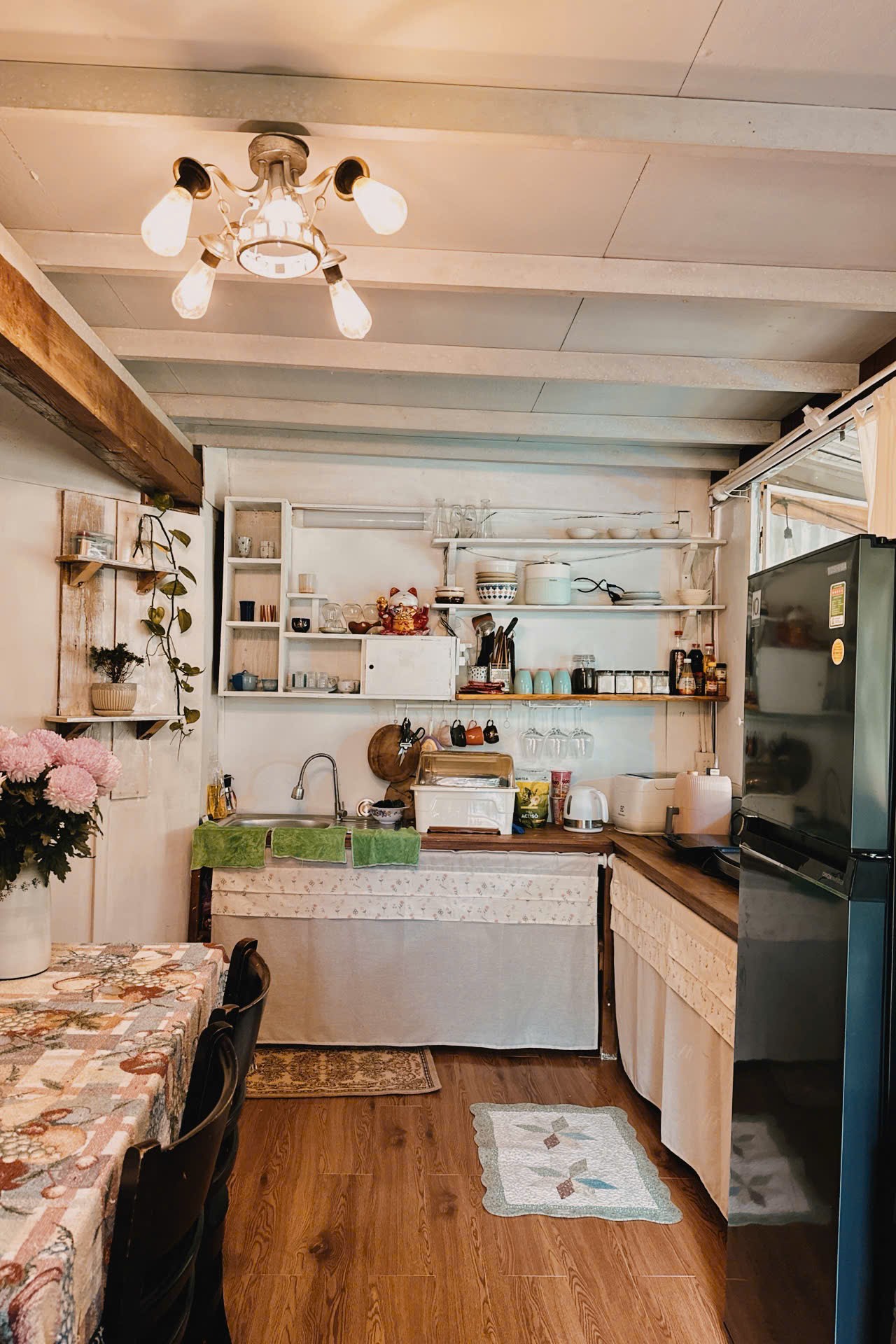 Tầng trệt là khu vực sinh hoạt chính – nơi bạn có thể nấu nướng, trò chuyện hoặc tận hưởng buổi chiều yên tĩnh. Bếp được chuẩn bị đầy đủ từ tủ lạnh, nồi chiên không dầu, bếp từ, nồi hấp, vỉ nướng điện cho đến máy pha cà phê. Chỉ cần một chút thời gian, bạn có thể quây quần cùng nhau để nấu bữa tối hoặc pha một tách cà phê rồi bước ra ban công, ngắm rừng thông trong không gian tĩnh lặng đầy thi vị.