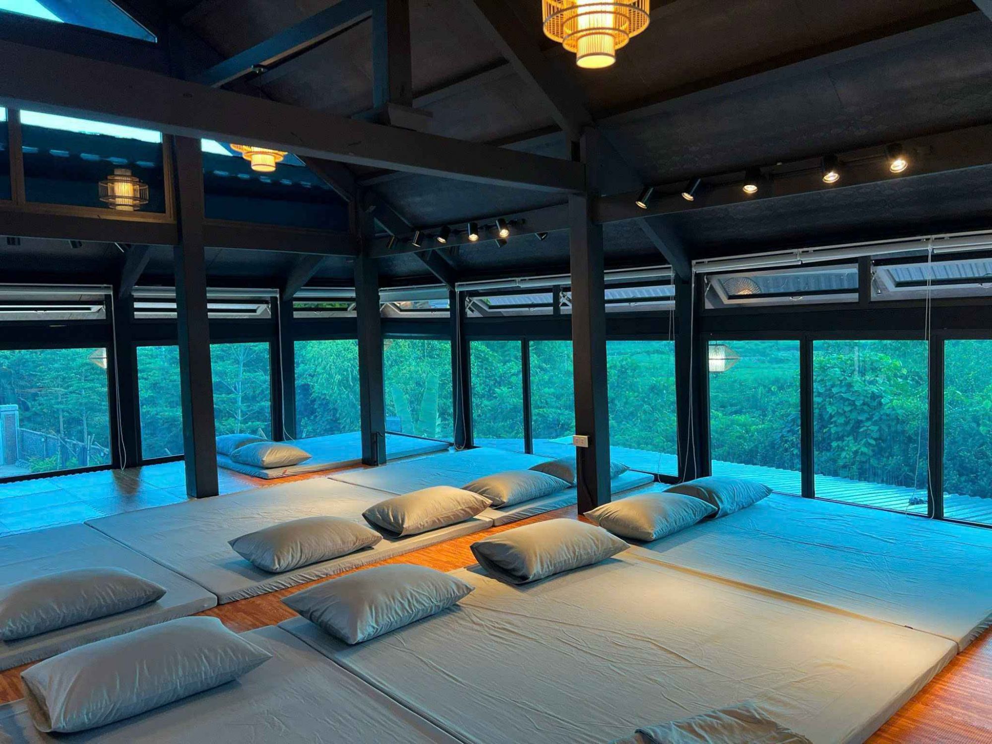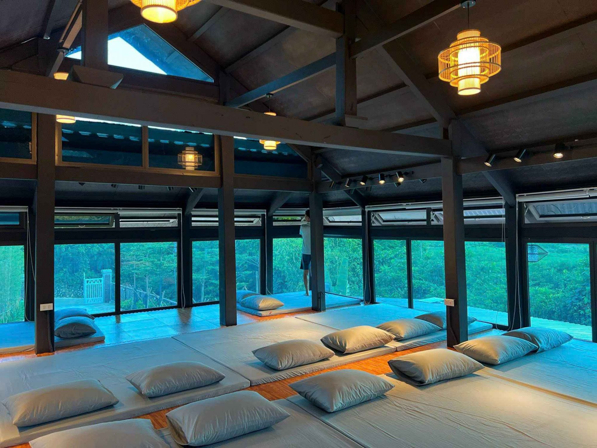Nhà sàn được xây dựng 2 tầng với công năng rõ ràng. Tầng 1 là quầy lễ tân và khu vực phục vụ ăn uống, nơi du khách có thể thưởng thức những bữa ăn đậm chất địa phương trong không gian ấm cúng. Tầng 2 được bố trí thành phòng ngủ tập thể rộng rãi, phù hợp cho nhóm bạn, gia đình đông thành viên hay các đoàn team building. Cấu trúc gỗ mộc mạc kết hợp cùng cách bày trí tối giản tạo nên cảm giác gần gũi, thân thiện và thoải mái.
