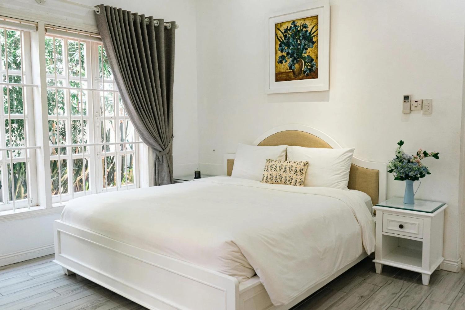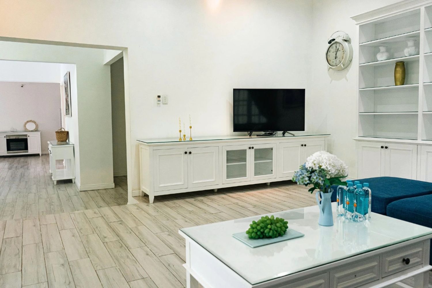3 phòng ngủ rộng rãi, cửa kính lớn nhìn ra vườn/hồ bơi, trang bị Smart TV
