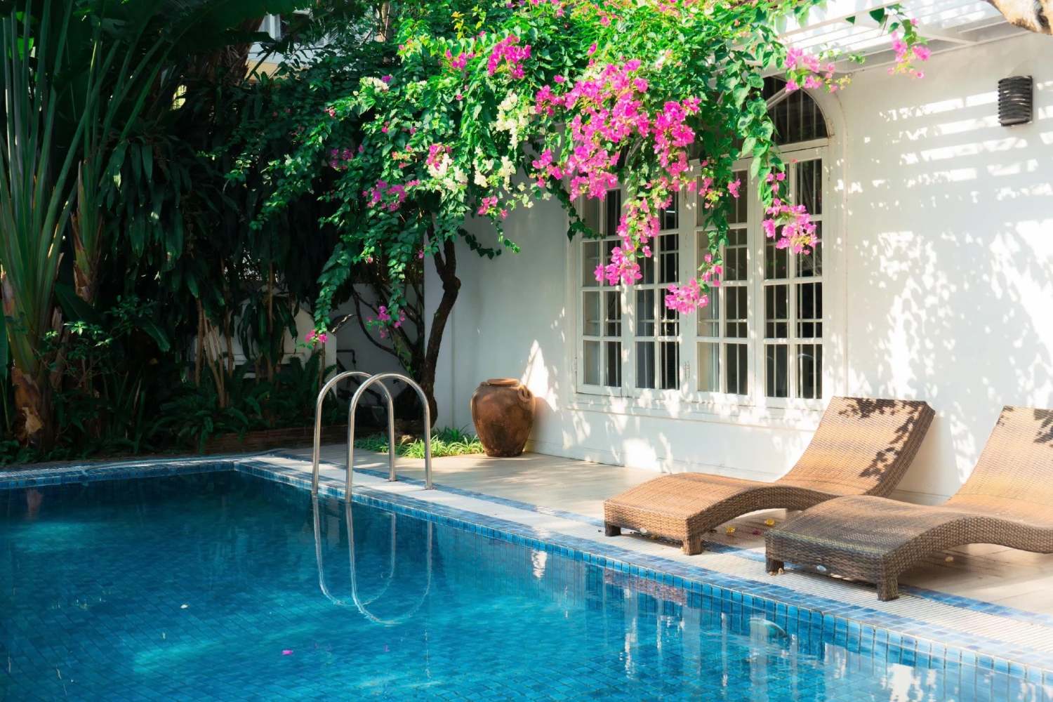 Hồ bơi riêng với ghế tắm nắng, khu vực nông an toàn cho trẻ nhỏ