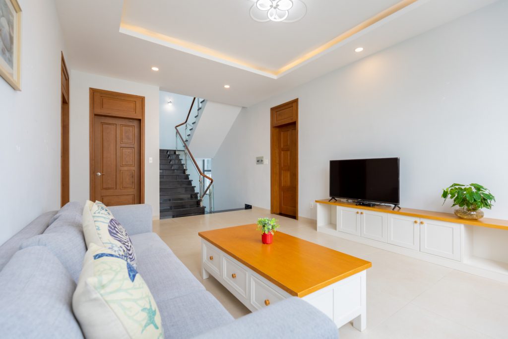 Nội thất của villa được trang bị đầy đủ các tiện nghi cần thiết như tivi, máy lạnh, tủ lạnh, bếp ăn, bàn ăn rộng rãi cùng không gian sinh hoạt chung thoáng đãng, tạo điều kiện cho cả nhóm quây quần, trò chuyện và tận hưởng thời gian bên nhau.