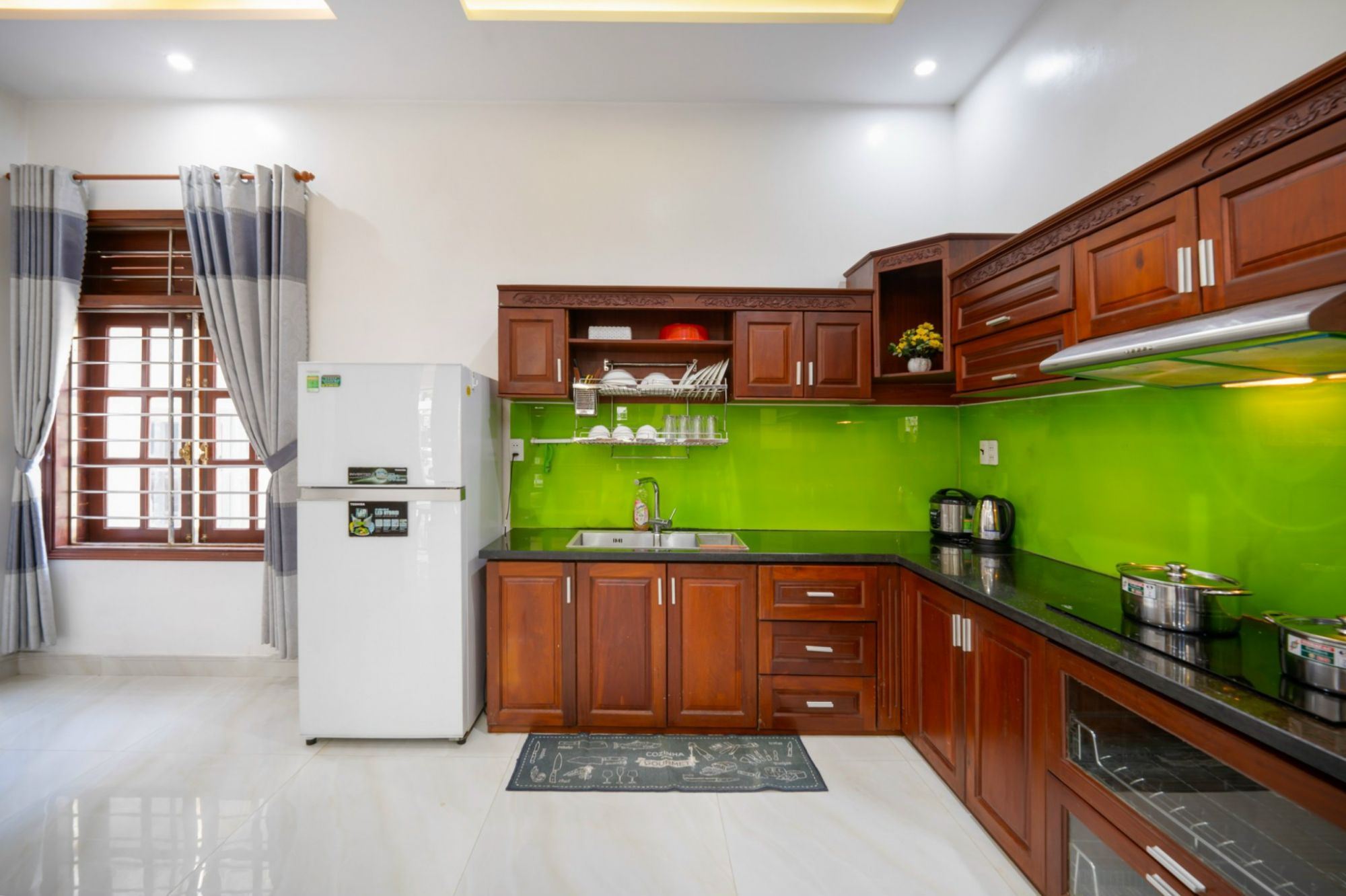 Trống Đồng Villa có 4 phòng ngủ sạch sẽ, với sức chứa lên đến 14 người. Đây là lựa chọn lý tưởng dành cho các nhóm bạn, gia đình lớn hoặc team công ty đang tìm kiếm một nơi vừa rộng rãi vừa tiện nghi để nghỉ ngơi và vui chơi cùng nhau. Phòng khách được thiết kế thoáng đãng, có sofa và TV để mọi người cùng nhau thư giãn, xem phim hay trò chuyện. Đặc biệt, khu vực bếp rất rộng với đầy đủ tiện nghi như tủ lạnh 4 cửa, lò vi sóng, dụng cụ nấu ăn, chén bát,... giúp bạn có thể tự tay chuẩn bị những bữa ăn ấm cúng ngay tại villa.