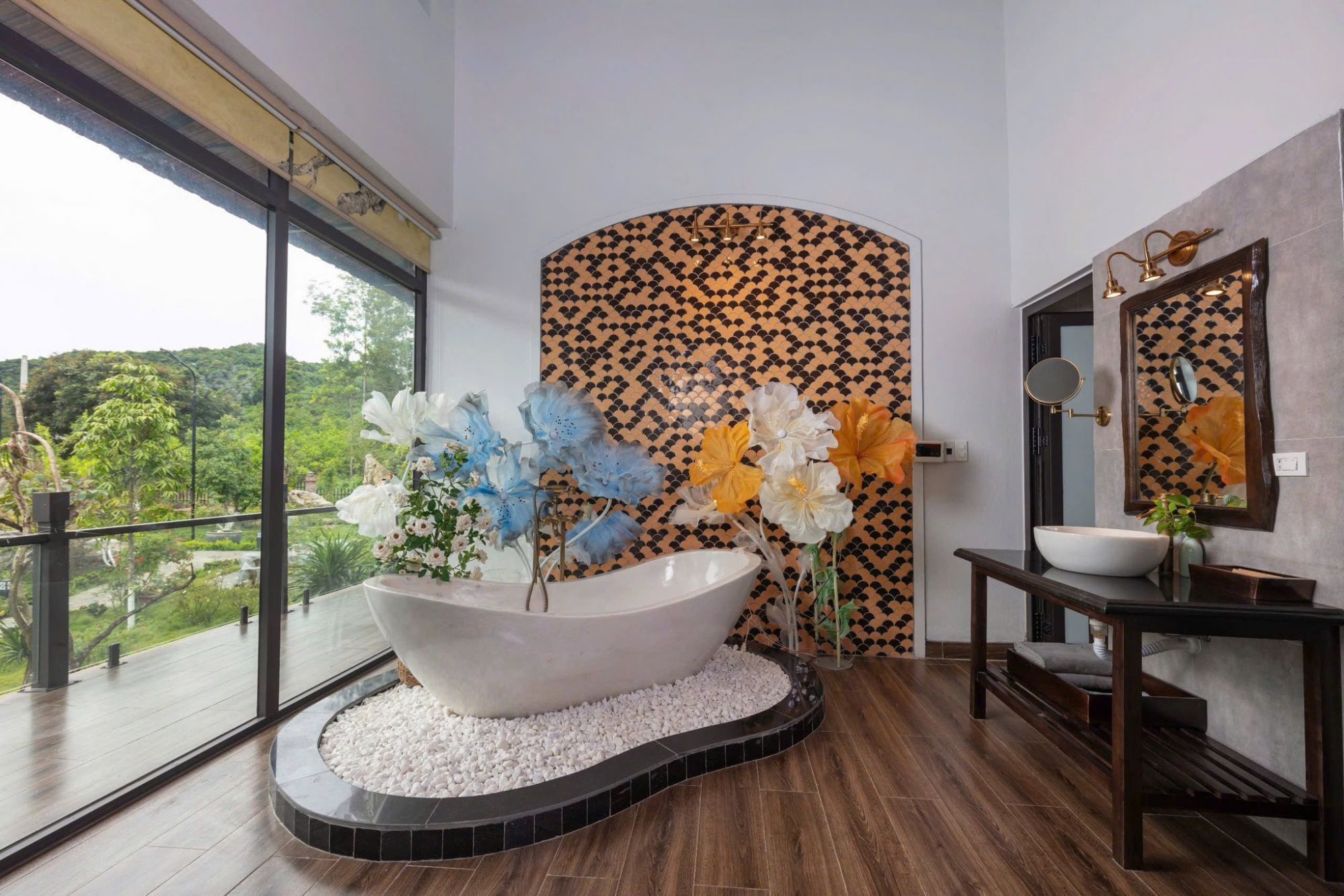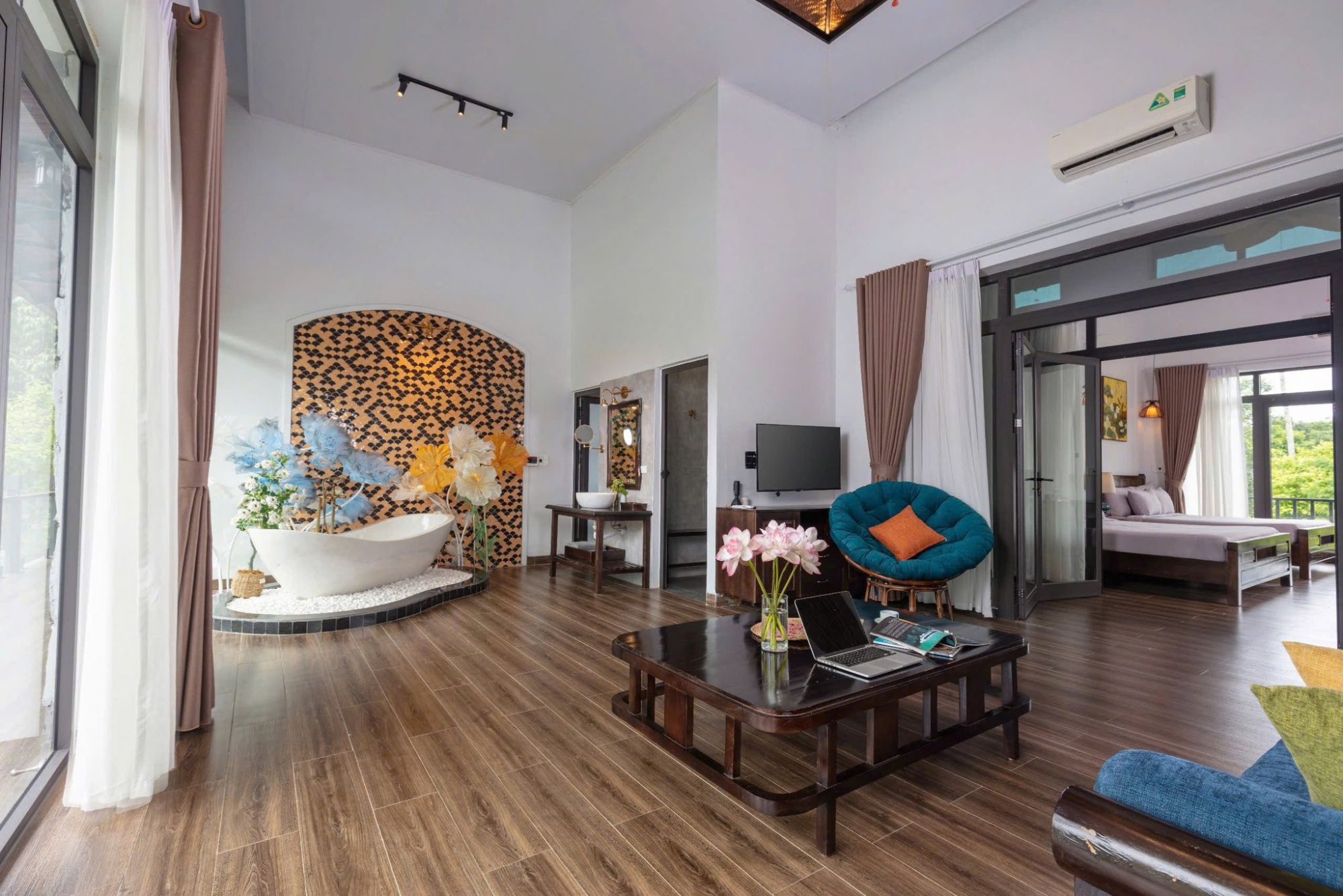 Phòng Master (66m²): Giường 2m2, bồn tắm đá, phòng xông hơi, ban công view hồ bơi