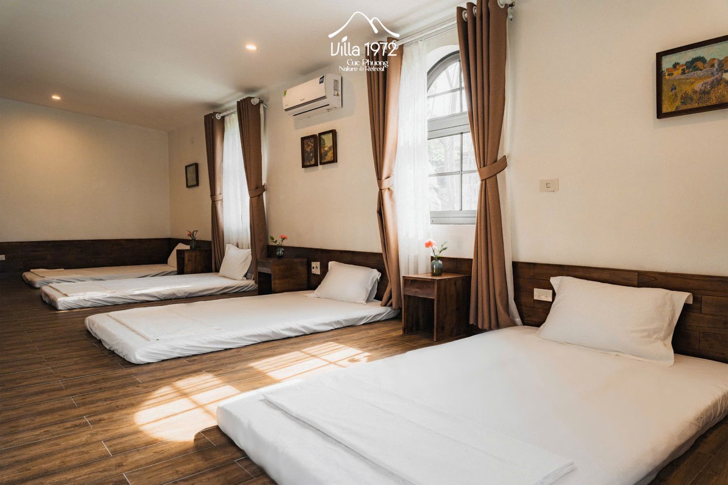 Căn nhà phù hợp cho nhóm từ 10–12 người. Tầng 1 gồm 2 phòng ngủ khép kín, mỗi phòng bố trí 1 giường đôi cỡ lớn, thích hợp cho các cặp đôi hoặc nhóm nhỏ cần không gian riêng. Tầng 2 là không gian mở với 6 giường đơn kiểu Nhật đặt liền kề, tạo nên bầu không khí ấm áp, thân mật cho cả nhóm cùng nghỉ ngơi.