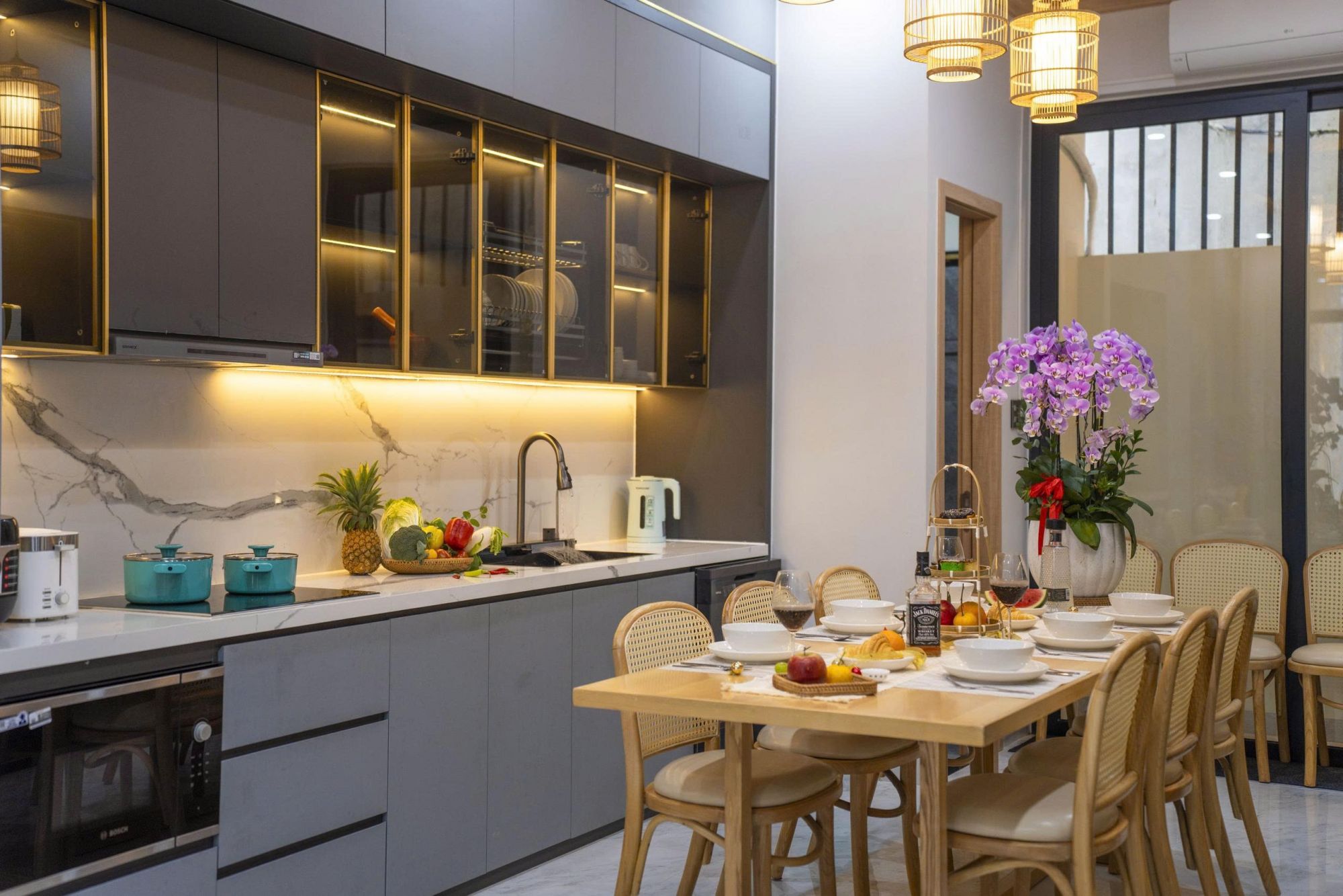 Phòng khách và khu vực bếp được thiết kế mở, tạo sự liền mạch trong sinh hoạt. Bố cục gọn gàng, tiện lợi giúp việc sử dụng trở nên dễ dàng và thoải mái trong suốt thời gian lưu trú. Đây là không gian lý tưởng để quây quần, dùng bữa, trò chuyện hoặc tận hưởng những khoảnh khắc thư giãn bên nhau mà không bị chia tách.