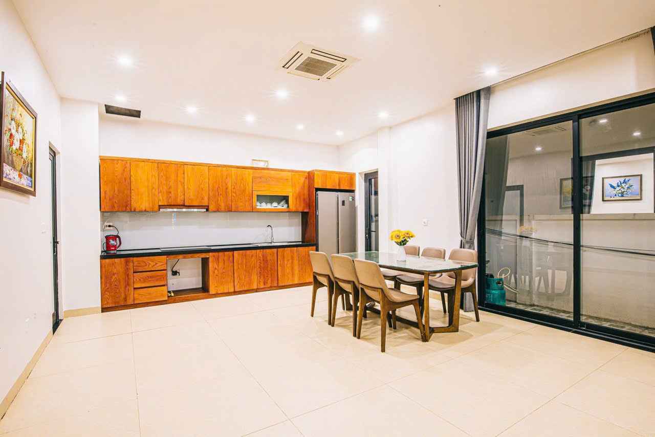 Villa sở hữu khu bếp đầy đủ dụng cụ phục vụ cho đoàn lớn: gồm một bếp từ, một bếp gas công nghiệp, nồi cơm điện, một bếp lẩu và một bếp nướng BBQ ngoài trời. Dụng cụ nấu ăn đầy đủ phục vụ đến 30 người cùng lúc, rất phù hợp để tổ chức các bữa tiệc ấm cúng, những bữa cơm sum vầy bên gia đình và bạn bè.