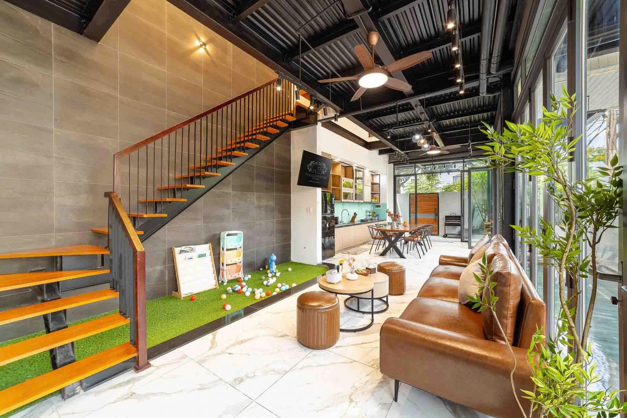 Ấn tượng dễ nhận thấy tại Villa Nguyễn Đình là không gian mở tràn ngập ánh sáng tự nhiên kết hợp hồ bơi riêng và khu vườn xanh mát, tạo nên cảm giác thư giãn nhẹ nhàng ngay giữa thành phố. Tổng thể villa mang phong cách hiện đại, thoáng đãng, phù hợp cho những chuyến nghỉ dưỡng cần sự riêng tư nhưng vẫn tiện lợi di chuyển.