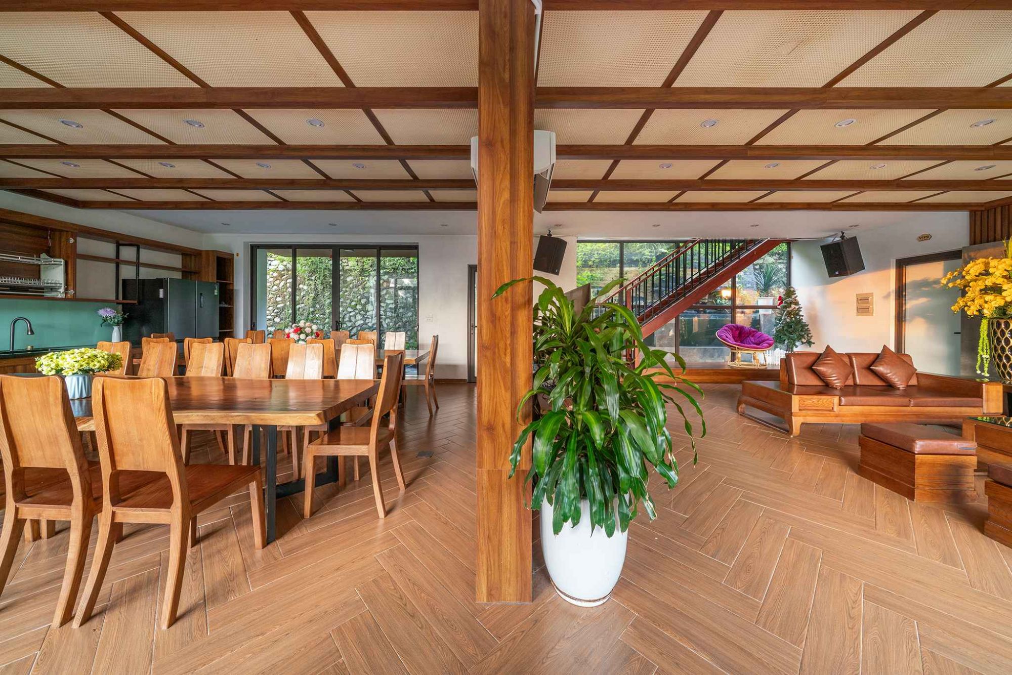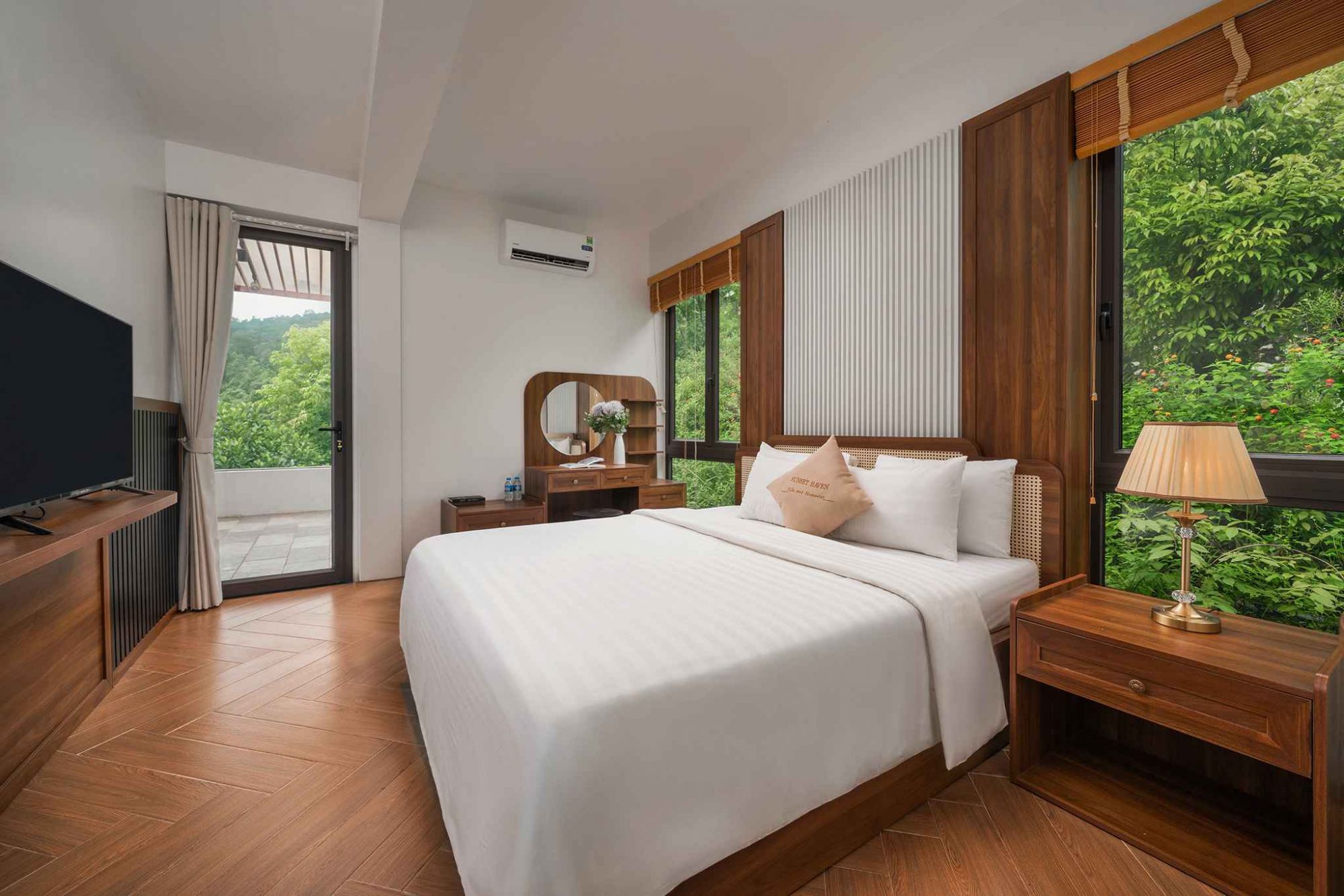 Không gian riêng tư và hiện đại: Tận hưởng sự thoải mái tại các căn villa được trang bị đầy đủ điều hòa và Wi-Fi miễn phí.