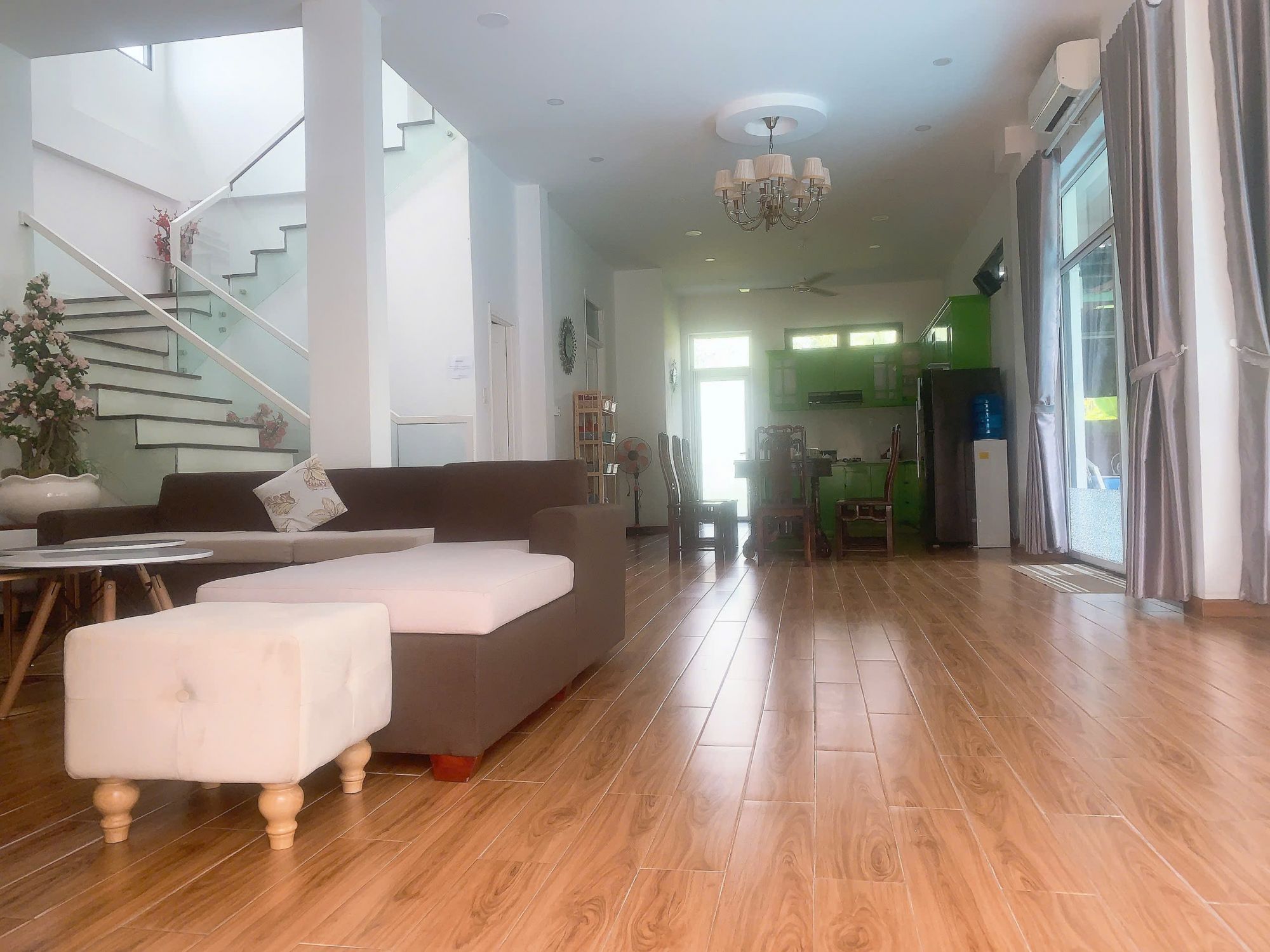Căn villa gồm 2 tầng với 5 phòng ngủ và 6 nhà vệ sinh khép kín – một điểm cộng lớn cho những ai không muốn phải chờ đợi khi đi theo nhóm đông người. Tầng trệt được bố trí linh hoạt với phòng khách liên thông bếp và một phòng ngủ riêng biệt có nhà vệ sinh riêng. Từ sofa, bếp cho đến các chi tiết nhỏ như lò nướng, nồi niêu, đều được chuẩn bị đầy đủ. Không gian sân vườn phía trước được bố trí bàn ghế tổ chức tiệc BBQ, kèm theo máy giặt tiện lợi cho những chuyến đi dài ngày.